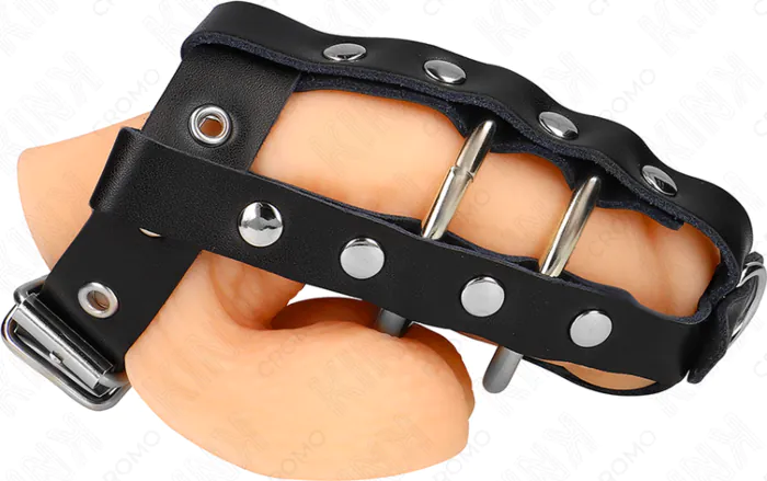 Experience intense control and amplified pleasure with this adjustable metal penis cage from KINK RING POWER, featuring integrated nipple clamps for simultaneous stimulation. Crafted from high-quality stainless steel, it ensures durability while providing a firm grip during use.