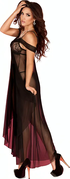 Experience the allure of this captivating long babydoll, crafted from high-quality mesh that gently caresses your skin. The mysterious lace top and daring slit add a touch of seduction, making it a must-have in your lingerie collection.