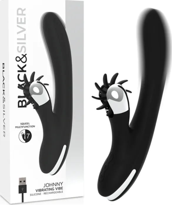 The BLACK&SILVER Bunny Johnny is a USB-rechargeable silicone vibrator that combines a strong tip-mounted motor with the Squeel multi-function system for focused clitoral and internal stimulation. With seven vibration programmes and seven clitoral patterns, it suits anyone wanting deeper, targeted waves rather than broad, surface buzz. Comes with a 6 ml water-based lubricant for immediate use.