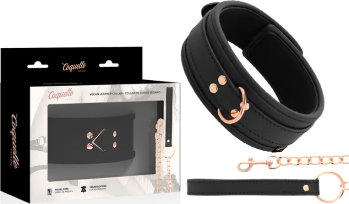 Experience safe and stylish BDSM with the Coquette Fantasy collar, designed for both dominance and submission. Crafted from vegan leather and featuring a strong nickel-free metal chain, this collar ensures comfort and safety during your playtime.