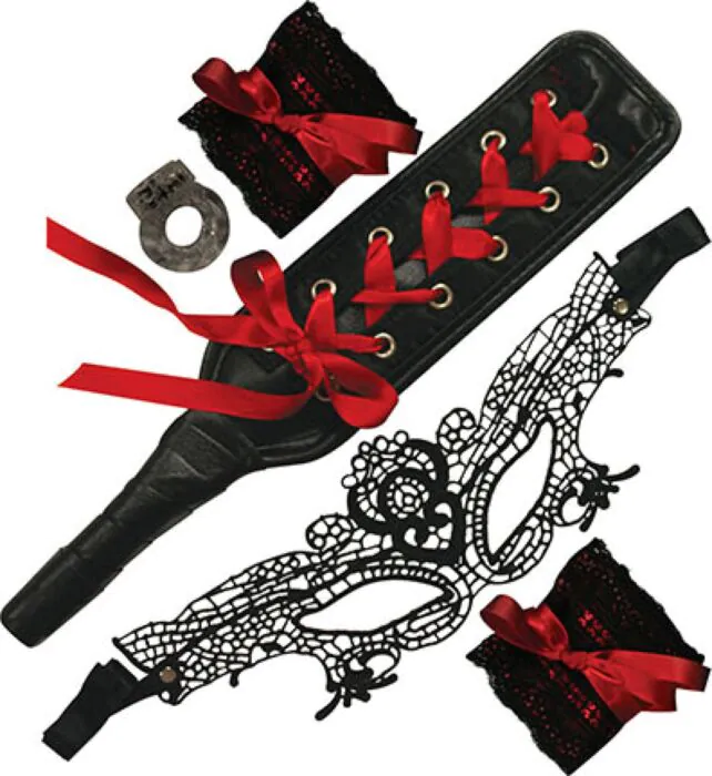 The kit includes black lace handcuffs with red bows, a black lace mask, a black paddle with red satin lacing, and a vibrating cock ring, making it a comprehensive starter set for bondage.