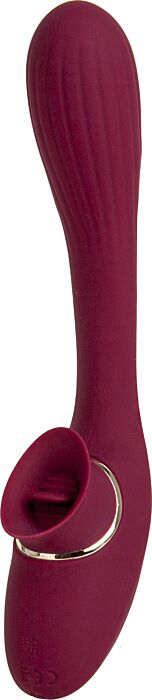 This is a dual-stimulation vibrator designed to give internal G‑spot vibrations and simultaneous clitoral contact from a flexible tongue. It’s aimed at anyone who prefers combined internal and external stimulation without handling two separate toys: the insertable shaft is soft with a rounded tip and a flexible section so it sits comfortably and adapts to your body. The clitoral arm uses a very flexible tongue that delivers taps and caresses rather than only continuous buzzing — two different sensations from two independent motors.