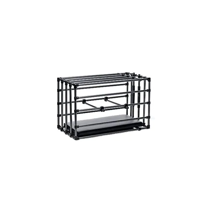 ¡Inmoviliza a tu sub en tu posición favorita! La perrera es una jaula ajustable con una tabla acolchada y barras de posicionamiento opcionales. Cierra a tu sumiso dentro de la carcasa de metal revestido y sé creativo.