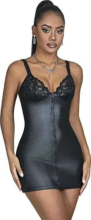Unleash your bold side with the SUBBLIME sexy dress, featuring a striking leather effect that beautifully accentuates your silhouette. Crafted from a blend of 95% polyester and 5% elastane, it offers a comfortable and flattering fit that moves with you. The eye-catching front zipper adds an audacious touch, allowing for playful styling, while the floral lace inserts provide a tantalising hint of skin.