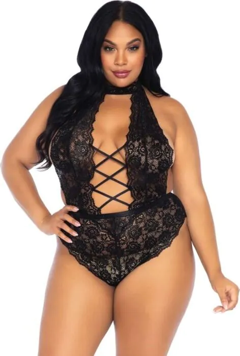 A plus-size, crotchless teddy from Leg Avenue Teddies with a floral lace pattern and a lace-up front opening. It’s a piece that flatters curves while letting you adjust the fit at the front. Choose this if you want something sensual yet breathable; skip it if you need structured support or full coverage.