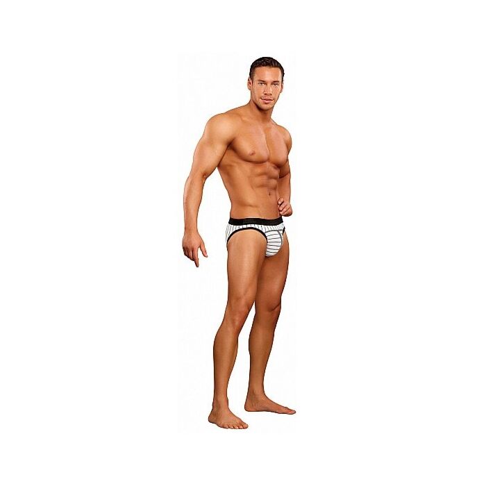 Slip de color blanco con raya diplomática negra. La cintura es ancha y elástica para acomodarse a tu cuerpo.