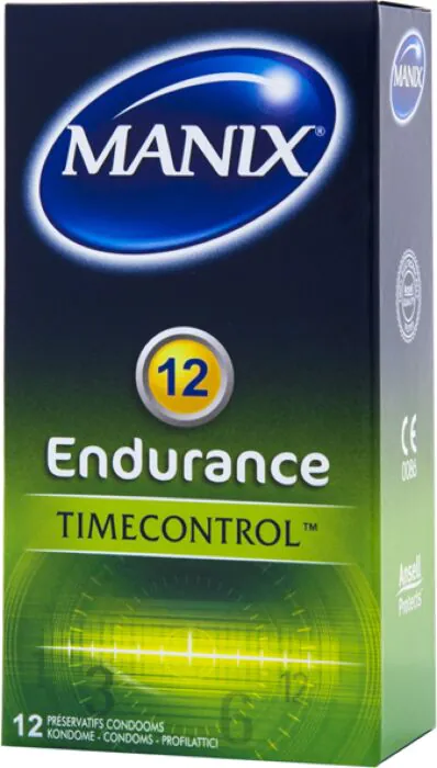 Manix Endurance are standard-fit latex condoms with a light lidocaine gel formulated to help delay ejaculation. They suit people who want a bit more control without changing routine — comfortable 53 mm nominal width, lubricated and with a reservoir. Not for anyone with a latex or anaesthetic sensitivity.