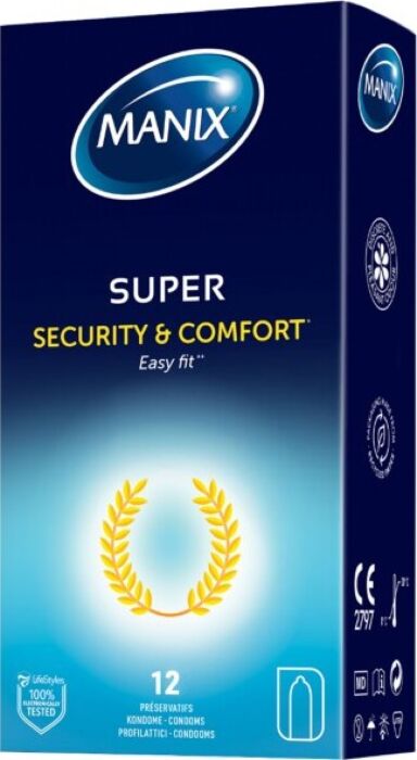 Manix Super are classic lubricated condoms made from natural latex, supplied in a box of 12. The straight, cylindrical shape with a reservoir tip gives a familiar, secure fit — the style most people expect when they want simple, dependable protection. Electronic testing means every condom has been checked for holes, so you’re buying a product made to standard quality checks.