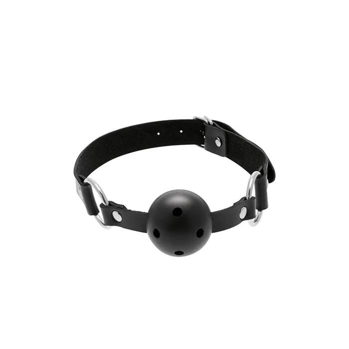 A breathable ball gag for BDSM play that puts safety and comfort first. The soft rubber ball has air holes to help the wearer breathe, while metal rings and an adjustable leather strap give a secure fit. Good for partners wanting firm control without full airway restriction. If you want a heavier or completely silent gag, consider other styles.