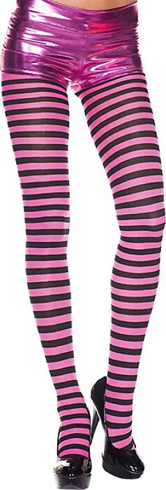 These are opaque tights by Music Legs featuring a fuchsia base sprinkled with black stripes. In plain terms: they give you the coverage of thicker hosiery while adding a graphic stripe for visual impact. Opaque means they hide more of the leg than sheer tights, so they’re good for cooler weather, modest looks or when you want a stronger colour to show through an outfit.