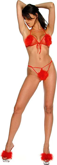 A playful bra and transparent thong set from Music Legs, trimmed with feather pom-poms in red. Designed for boudoir moments and playful dressing, it’s a decorative piece rather than everyday underwear. Choose this if you want a flirty, lightweight set for special occasions; avoid if you need structure or machine‑wash durability.