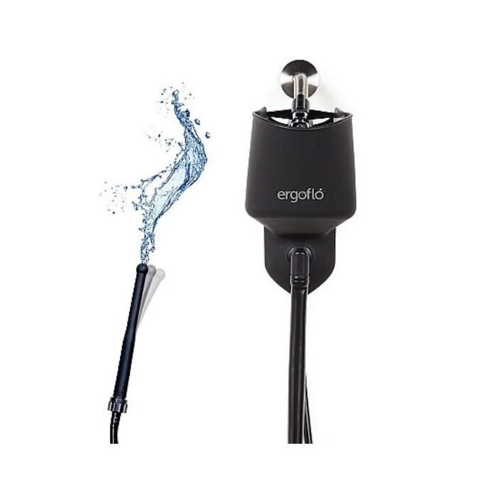ergofló pro is a shower and travel anal douche that you can set up and remove in seconds. ergofló converts high pressure to a comfortable flow to clean quickly and efficiently. The system snaps on to any standard shower hose pipe with the shower clip and includes: a superior silicone funnel bag, a 6’ (183 cm) silicone douche hose, a 5’ (152 cm) silicone drain hose, the world’s only 8” (20 cm) silicone flex-tip nozzle to reach where you want, a premium 5” (13 cm) ABS plastic tip, and a nylon storage bag for easy travel and storage. The system folds to a compact size for storage and travel in the nylon storage bag.