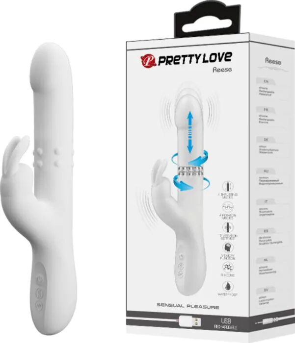 Experience powerful dual stimulation with the Pretty Love Reese rabbit vibrator. Designed for those who crave simultaneous clitoral and G-spot pleasure, this versatile toy offers 12 vibration modes and rotating action for an memorable experience.