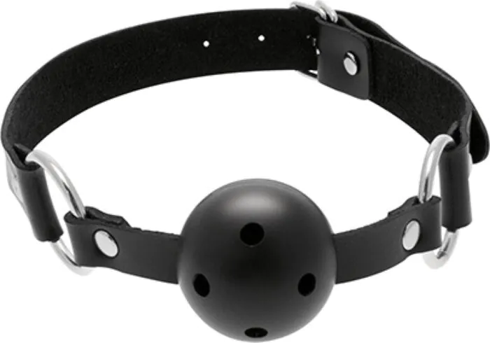 A breathable ball gag for BDSM play that puts safety and comfort first. The soft rubber ball has air holes to help the wearer breathe, while metal rings and an adjustable leather strap give a secure fit. Good for partners wanting firm control without full airway restriction. If you want a heavier or completely silent gag, consider other styles.
