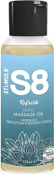This is a body massage oil from STIMUL8's S8 range, the Refresh scent — French plum with Egyptian cotton. It’s a three‑oil formula (sesame, sweet almond and jojoba) boosted with vitamins and minerals, so it feels nourishing on the skin rather than just oily. In the shop I’d tell you it’s a good option if you want a moisturising glide for a longer massage and a subtle scented finish.