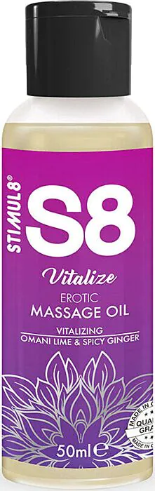 This is a 50ml erotic massage oil from STIMUL8's S8 line, fragranced as Vitalize (Omani lime & spicy ginger). It’s a true oil-based blend that moisturises and leaves skin feeling soft after a massage. The strength here is the combination of jojoba, almond and sesame oils with added vitamins and minerals — that means the product isn’t just gliding lubricant, it also helps condition and nourish the skin while you massage.