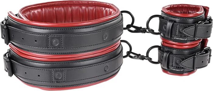 A pair of padded thigh-to-wrist restraint straps from Sportsheets, designed to reduce arm and leg mobility while staying comfortable. Each element connects thigh and wrist and can be used separately or combined via buckles and clips for multiple restraint setups. Good if you want comfortable, adjustable BDSM play without heavy hardware.