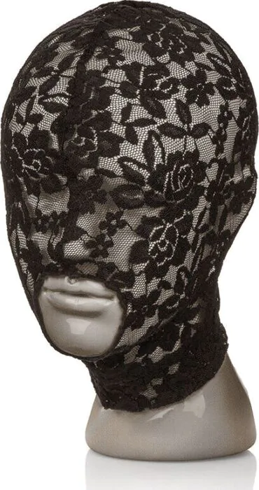 A soft lace hood from CalExotics designed for sensory-restrictive play and bondage. The open-mouth styling keeps communication and breathability possible while the delicate polyester lace adds a teasing visual barrier. Suited to couples and kink-curious users who want a lighter, breathable alternative to full hoods.
