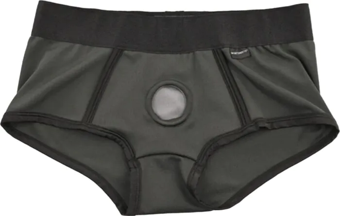 A soft, boxer-style harness from Sportsheets that’s made for everyday wear. It takes a 38.1mm O-ring for a compatible dildo and has two discreet pockets for small bullet vibrators. Choose this if you want a comfortable, underwear-friendly harness that holds toys securely; not for larger-diameter toys or users needing heavy-duty harness hardware.