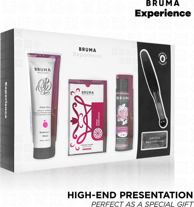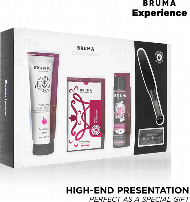 Experience playful intimacy with the BRUMA XPERIENCE Sweet Gum Temptation Kit. This delightful set combines the sweetest flavour with a bold liquid vibrator, great for enhancing every kiss and touch. Included are a lubricant, massage oil, a sensory feather, and a blindfold, giving you everything you need for a fun and sensual session.