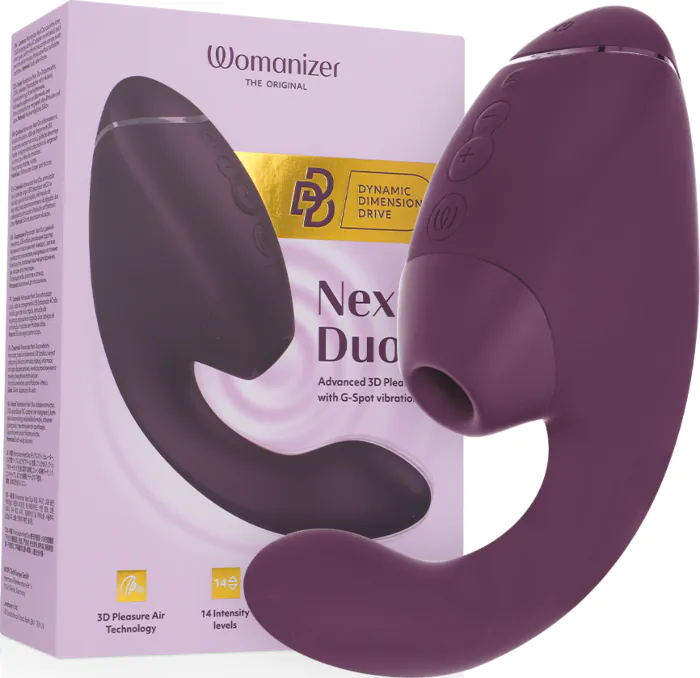 Experience the unique pleasure of simultaneous stimulation of the clitoris and G-spot with the Womanizer Duo Next. Featuring 3D Pleasure Air technology, it mimics natural suction for a sensation that is both deep and incredibly real. With a soft-touch medical-grade silicone and 14 levels of intensity across 10 vibration patterns, you have complete control over your pleasure journey.