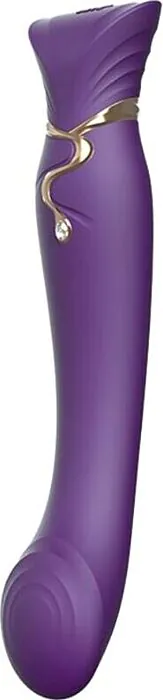 This is ZALO’s Queen PulseWave: a rechargeable G‑spot vibrator finished with a real Swarovski embellishment and luxury touches inspired by Cleopatra. It targets the G‑spot with a gently curved head, offers eight distinct vibration modes (steady, pulse and wave-style patterns among them) and includes a warming function for a more natural feel. Its mix of soft silicone and ABS gives a smooth, body-safe surface with a sturdy handle area and decorative metal detailing.